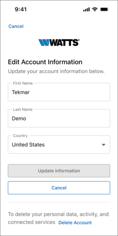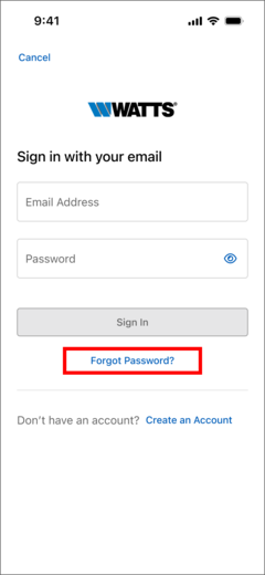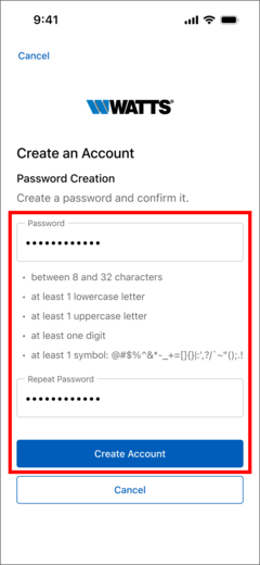 - Select "Create Account" button to create a new Watts Home account