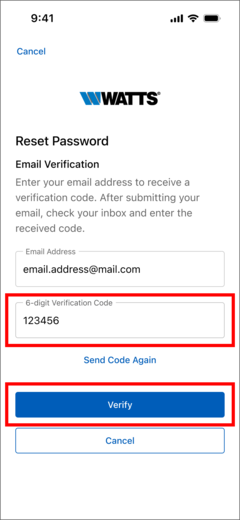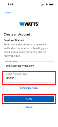 - Check your email inbox for an email from Watts with a verification code