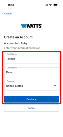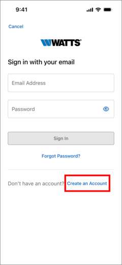- Select "Create Account" button to create a new Watts Home account