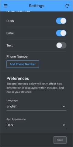 The app offers three appearance options: Light, Dark, and System. When System is selected, the app will automatically match your mobile device's appearance settings.