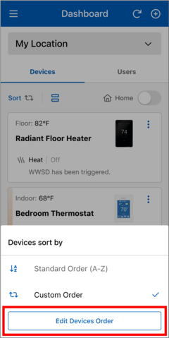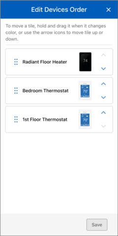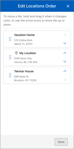 - On the "Edit Locations Order" page to move a location tile, press and hold until it changes color, then drag and drop it to your desired destination. Alternatively, you can use the arrow icons to move it up or down.
